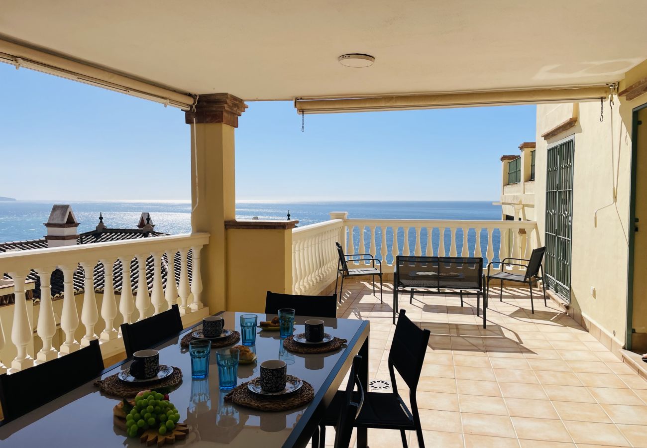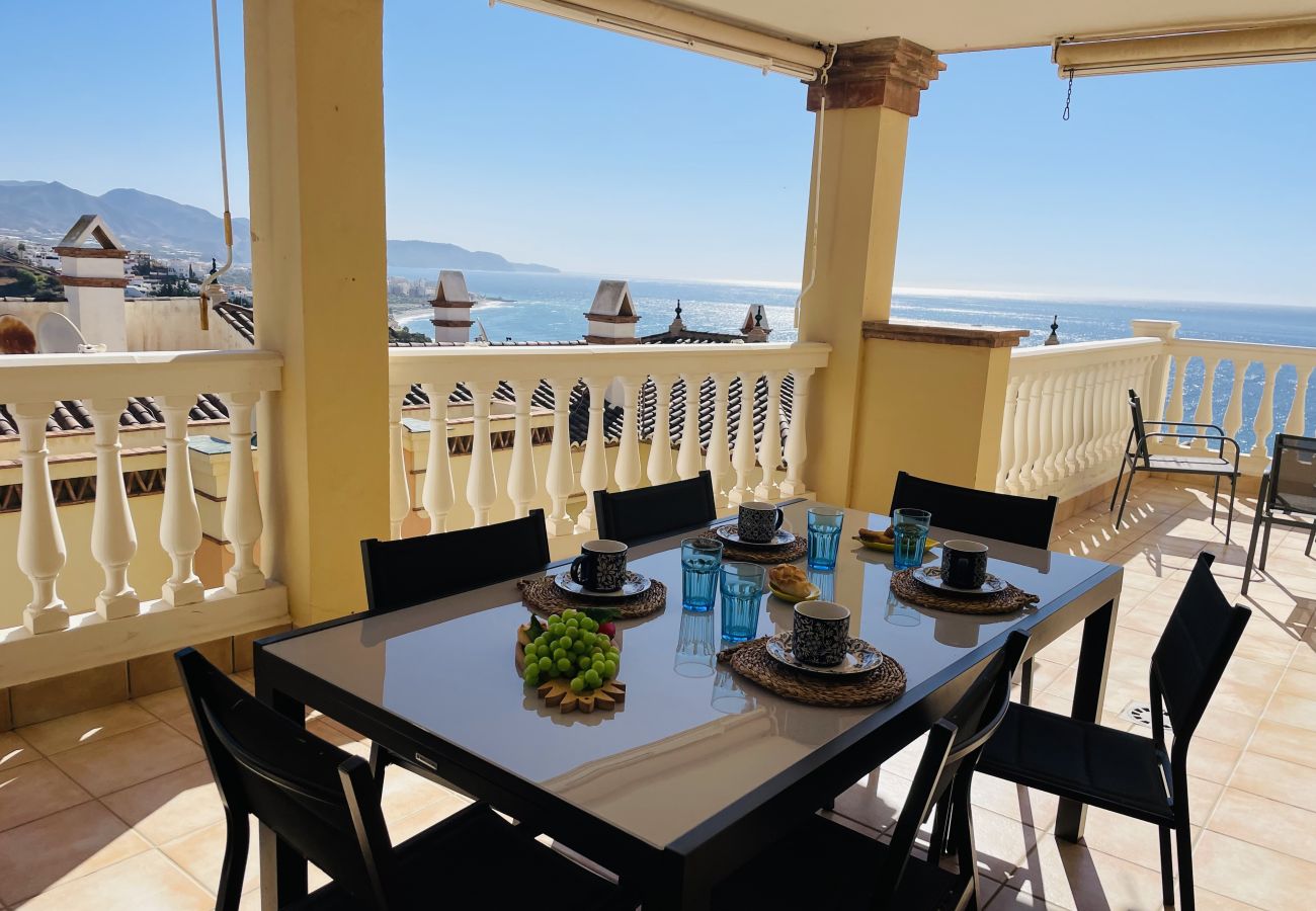 La propiedad consta de un acogedor recibidor, 3 dormitorios, 2 baños, una cocina americana completamente amueblada, y un luminoso salón-comedor con acceso a una amplia terraza soleada que ofrece vistas al mar, a las montañas y al pueblo de Nerja. Es una terraza perfecta para disfrutar durante los 365 días del año.