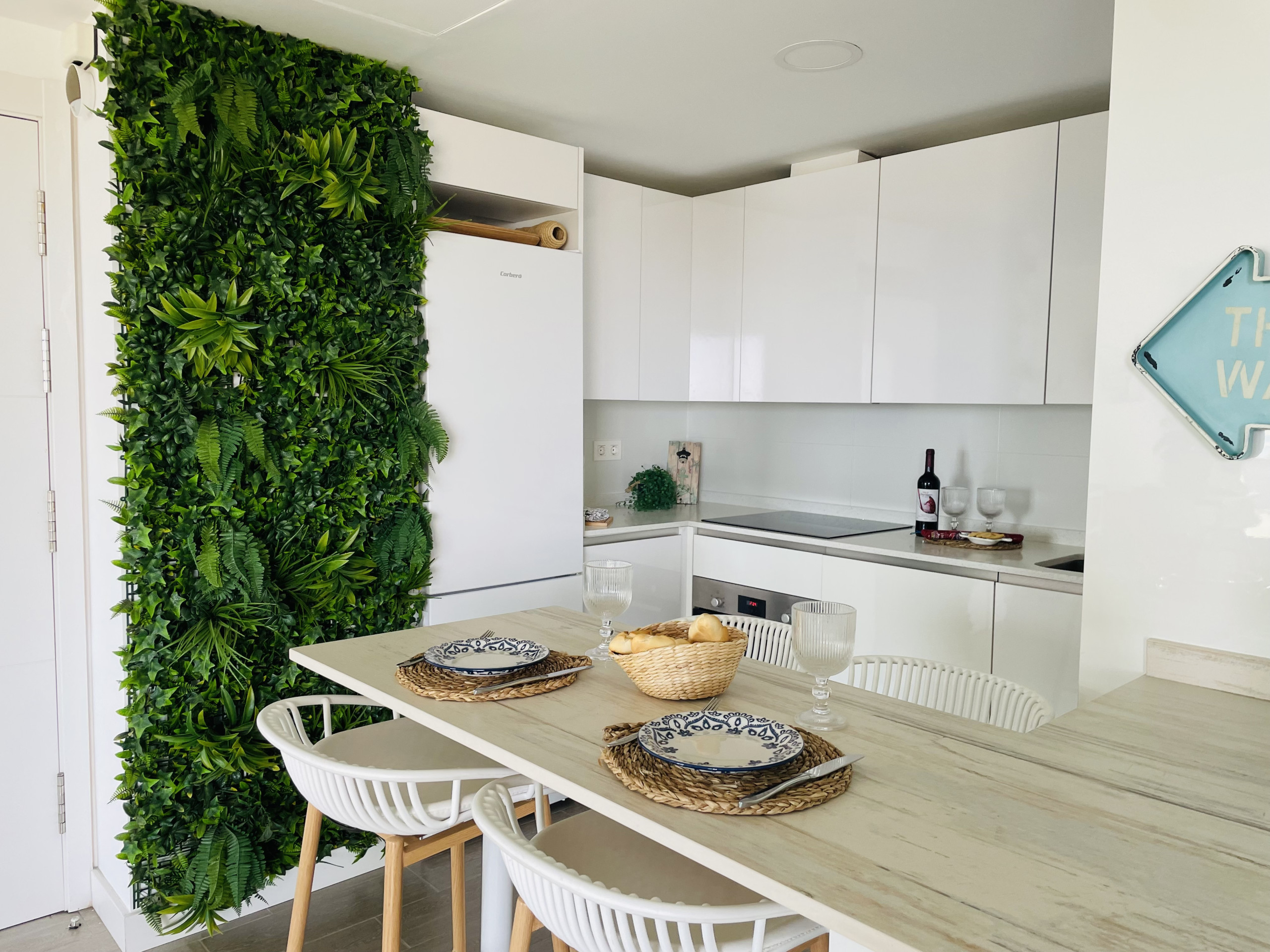 La luminosa sala de estar se funde con la cocina abierta, creando un espacio acogedor y perfecto para el entretenimiento. Disfruta de las vistas al mar mientras te relajas en el cómodo sofá o preparas deliciosas comidas en la cocina completamente equipada. Y para aquellos momentos de descanso al aire libre, la terraza amueblada te espera con muebles de exterior, donde podrás disfrutar de cenas al aire libre o simplemente relajarte y disfrutar del clima mediterráneo.