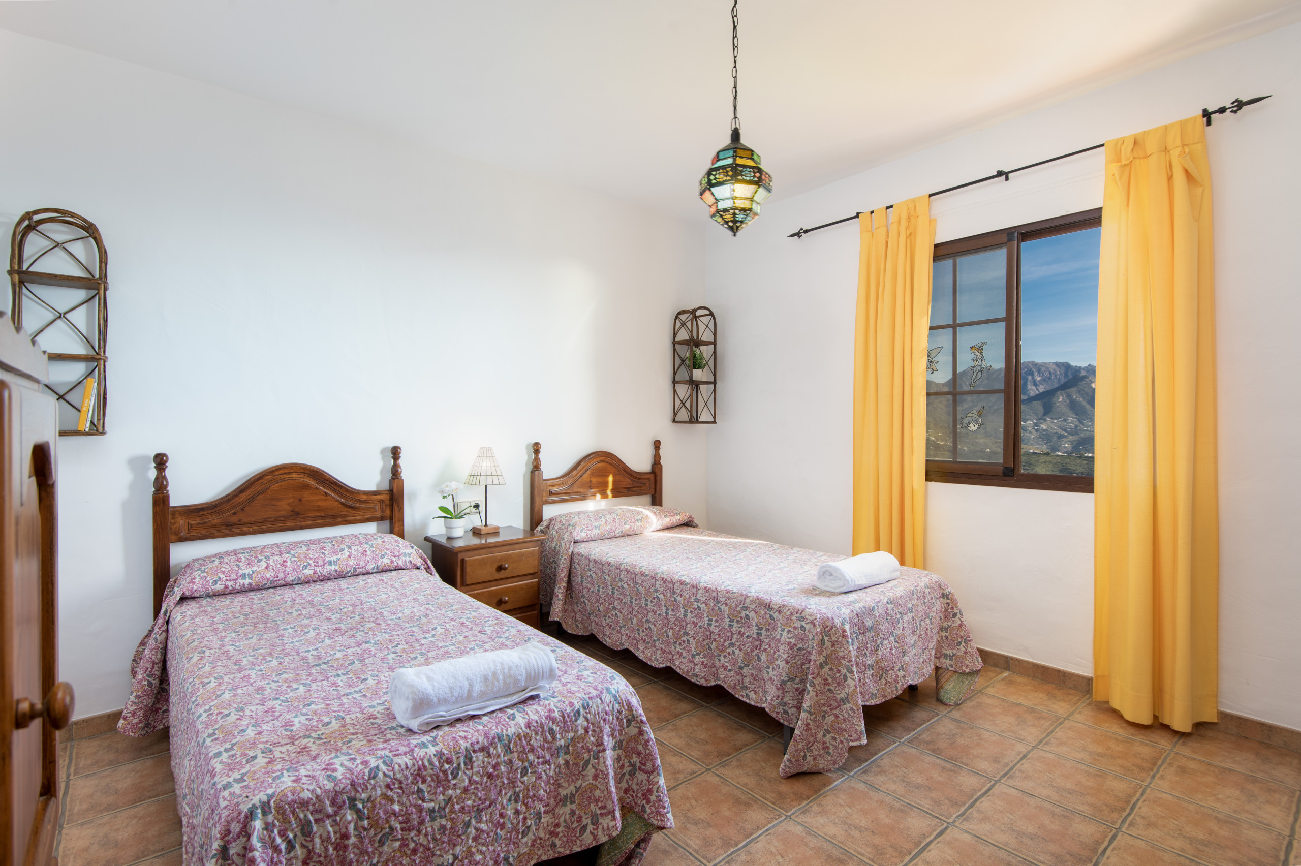 Este acogedor cortijo, de arquitectura tradicional y toques rústicos, se distribuye en dos plantas y cuenta con cuatro dormitorios: dos con cama doble y dos con dos camas individuales de 90 cm. En cada planta hay un baño con bañera, ofreciendo comodidad y privacidad para todos los huéspedes.