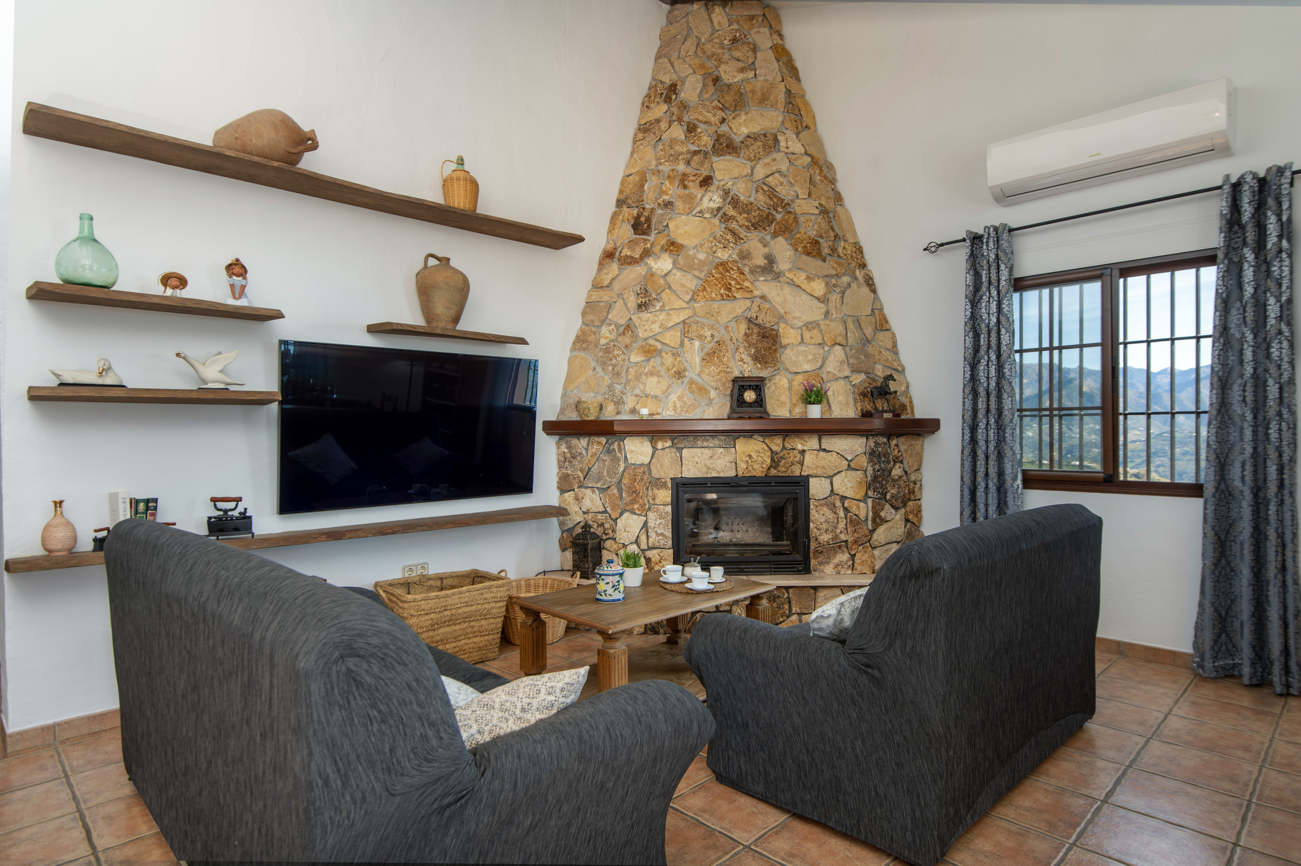 En la planta principal, el hogar se abre a un amplio y luminoso salón de estilo abierto, donde la chimenea de leña invita a largas sobremesas en invierno. La cocina americana, completamente equipada, mantiene el carácter tradicional sin renunciar a la funcionalidad. El cortijo también dispone de TV y WiFi, para combinar descanso y entretenimiento sin perder la conexión con el mundo exterior.