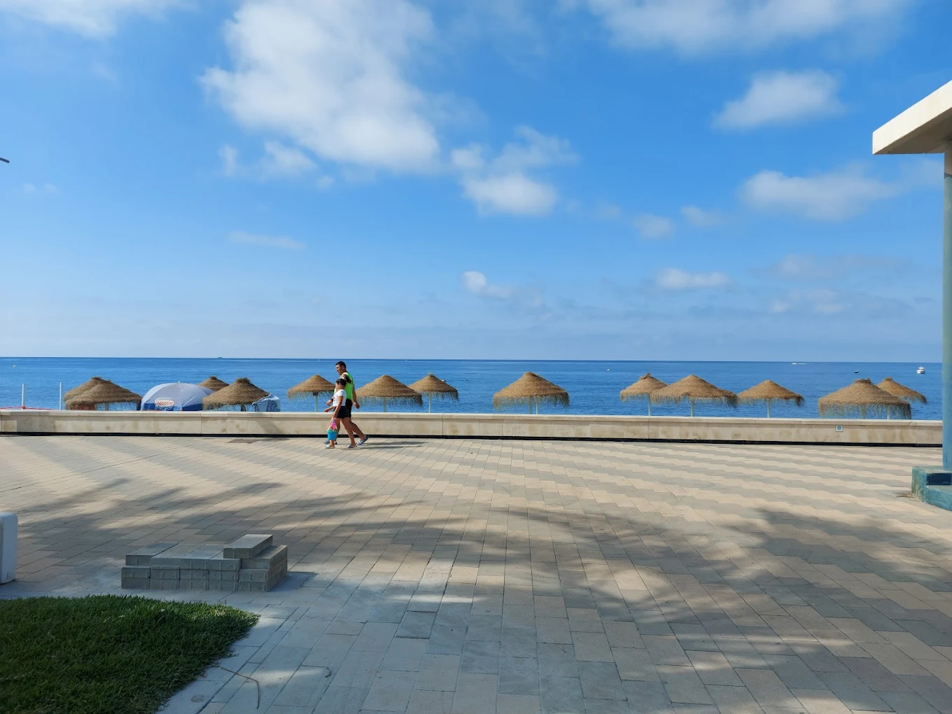 The promenade surface here is smooth and wide, with palm trees spaced along the edge. Benches face the sea, and there are small play areas for children set back from the main walking path.
