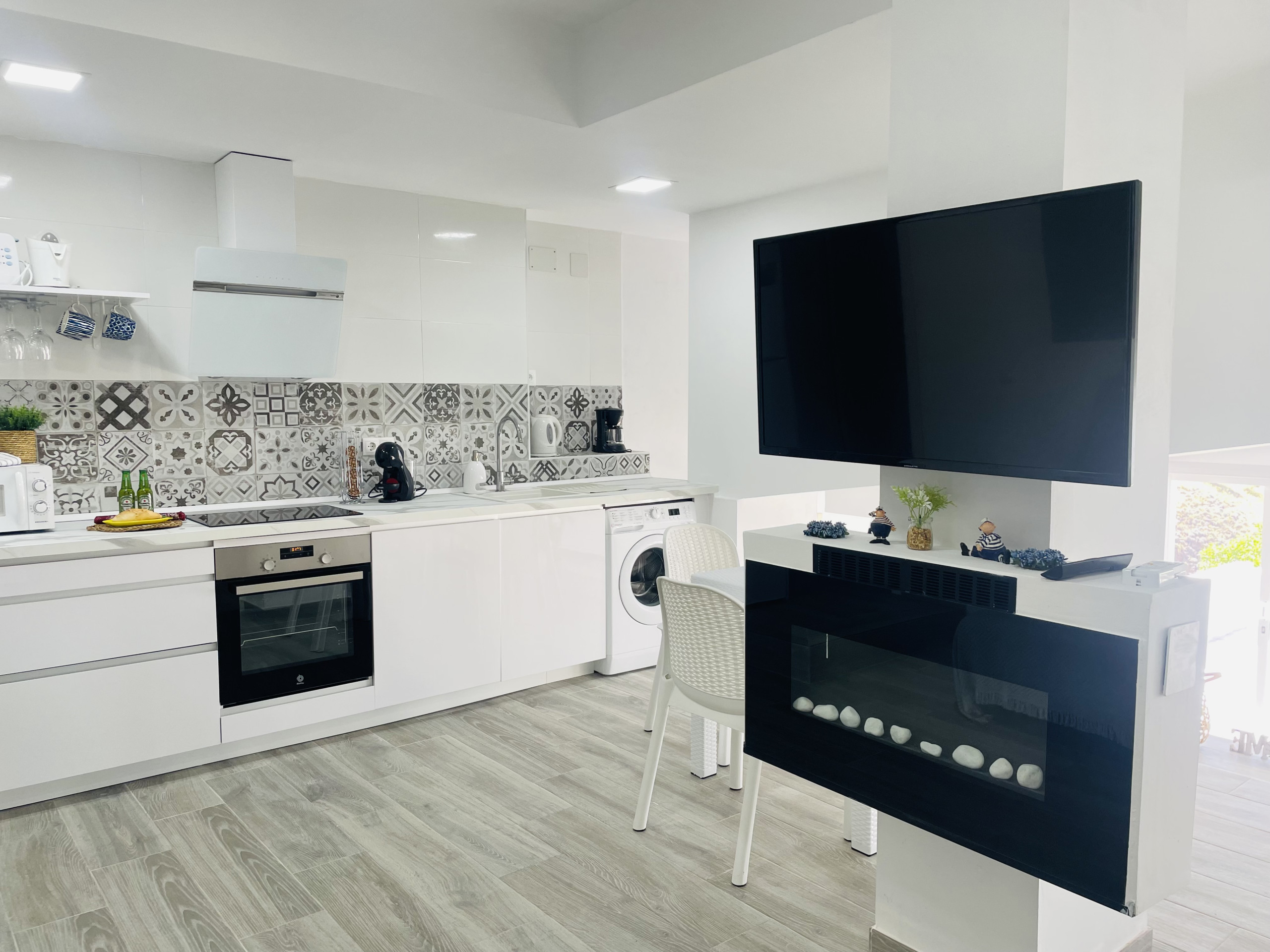Wohnzimmer mit offener Küche: Ein geräumiger und heller Bereich, perfekt zum Entspannen und gemeinsamen Essen. Die Küche ist komplett ausgestattet mit allen notwendigen Kochutensilien und Geräten.