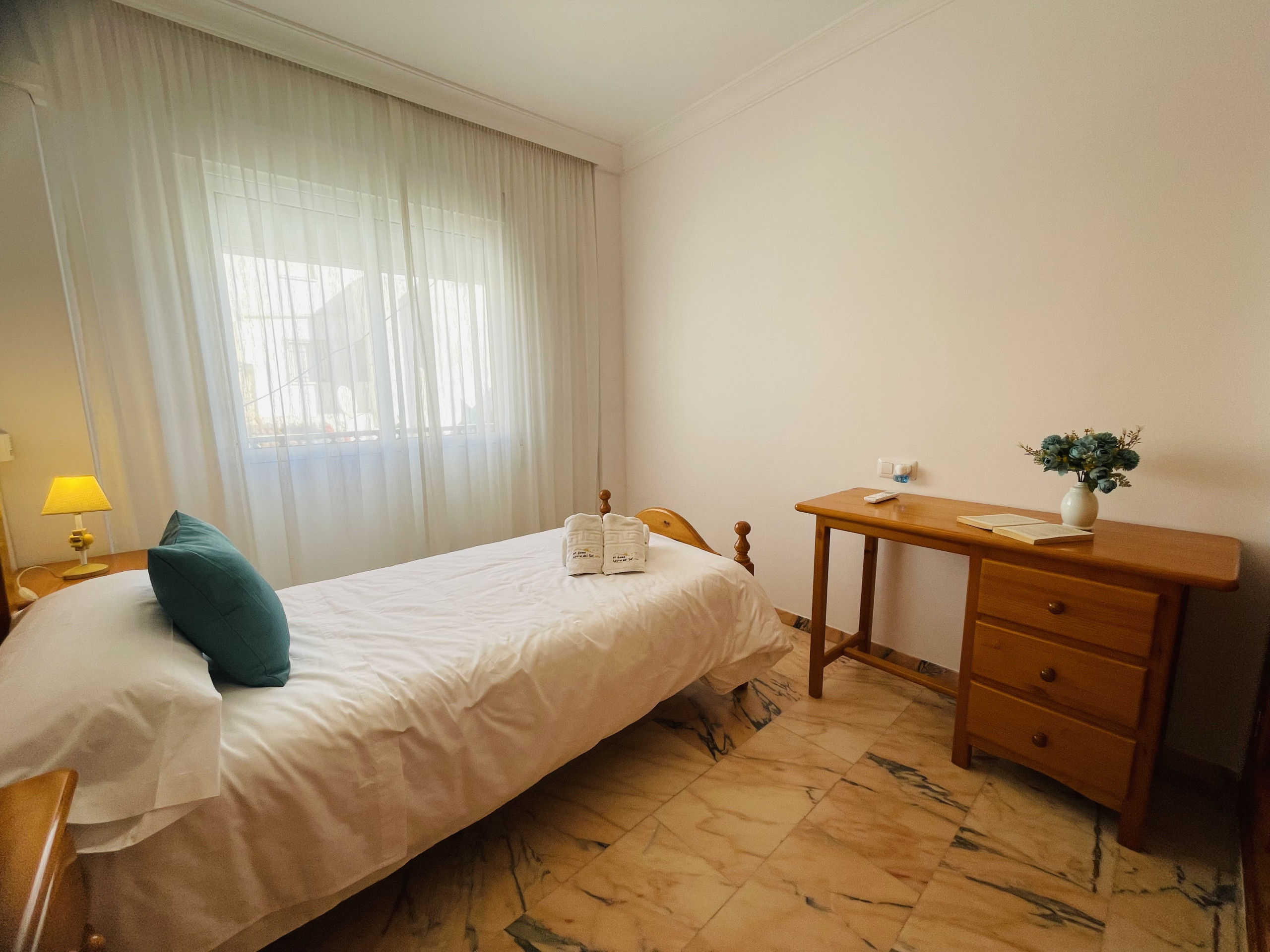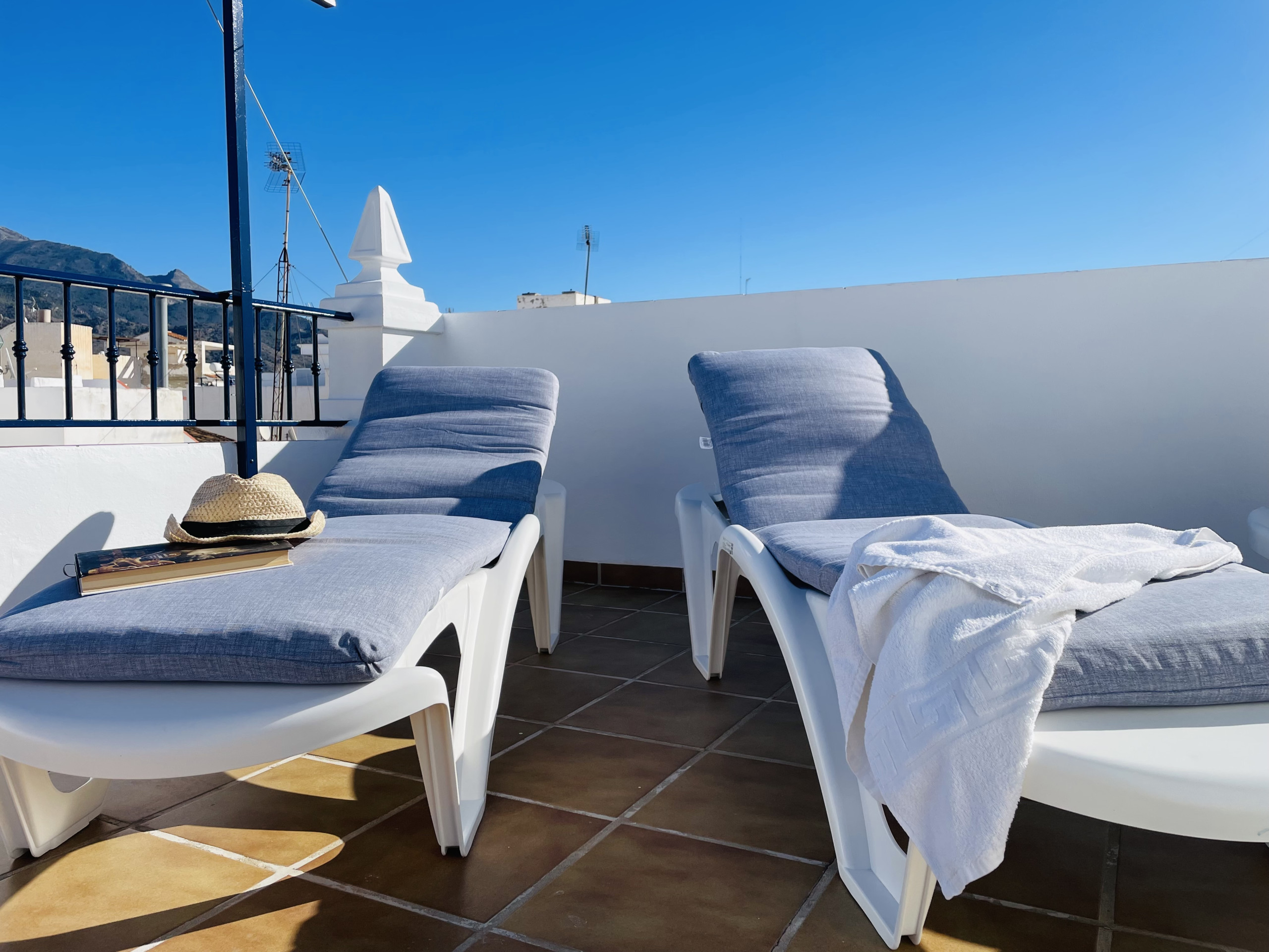 Im Außenbereich steht Ihnen ein privater Innenhof im Erdgeschoss zur Verfügung, mit Waschmaschine und Zugang zu einer Dachterrasse mit Sonnenliegen und Meerblick – ein perfekter Ort, um sich zu entspannen und die Sonne zu genießen.