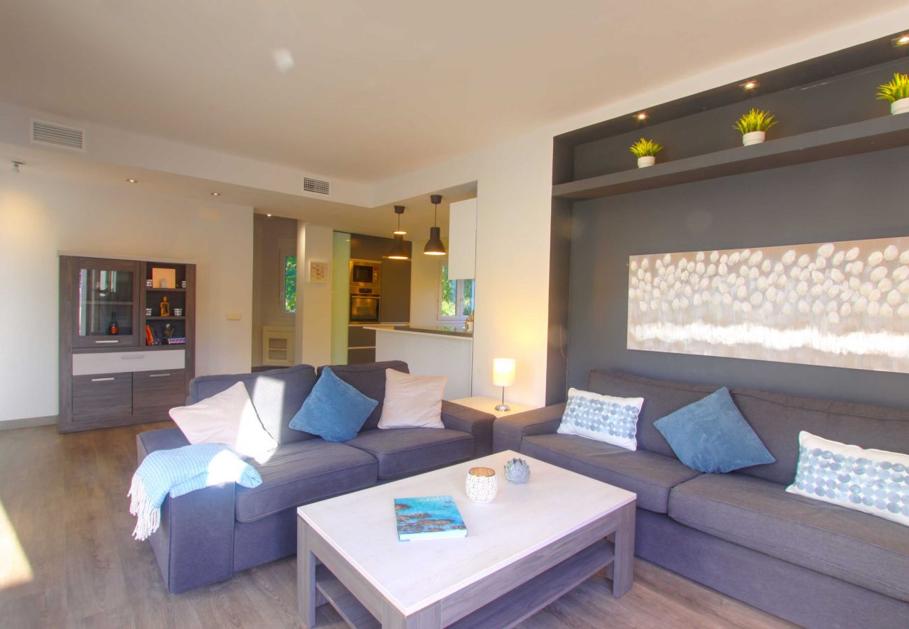 Das Wohnzimmer ist geräumig, hell und modern eingerichtet, mit einem bequemen Schlafsofa für bis zu sechs Personen. Von hier aus gelangen Sie auf eine Balkonterrasse mit Meerblick, ideal, um sich zu entspannen und die Aussicht zu genießen.
