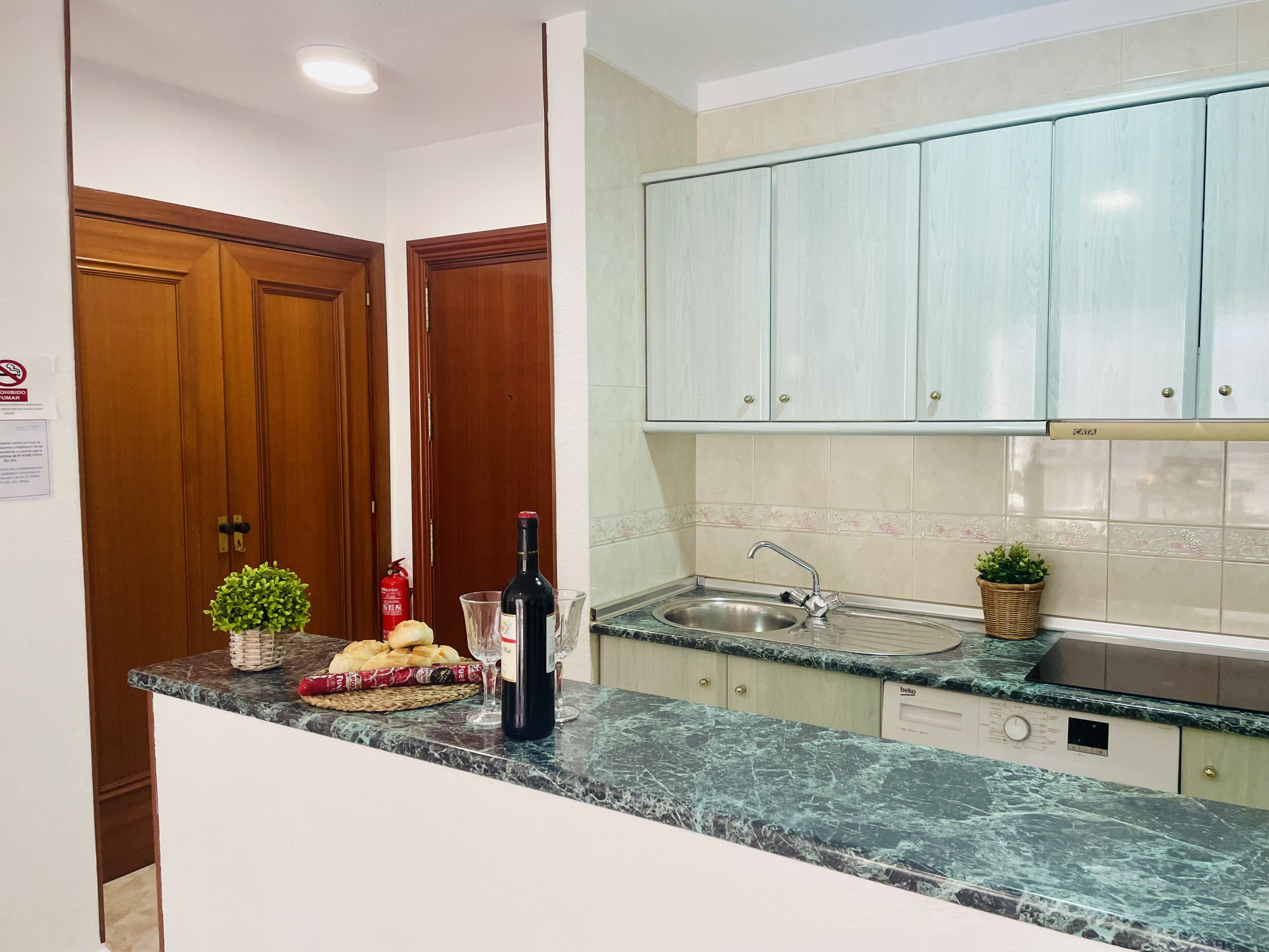 Mit einem gemütlichen Schlafzimmer, ausgestattet mit einem komfortablen Doppelbett und einem geräumigen Einbauschrank, garantiert diese Wohnung einen erholsamen Aufenthalt. Die separate Küche ist komplett ausgestattet mit Utensilien und allem, was für einen gelungenen Urlaub benötigt wird. Darüber hinaus verfügt die Wohnung über eine Klimaanlage für ganzjährigen Komfort.