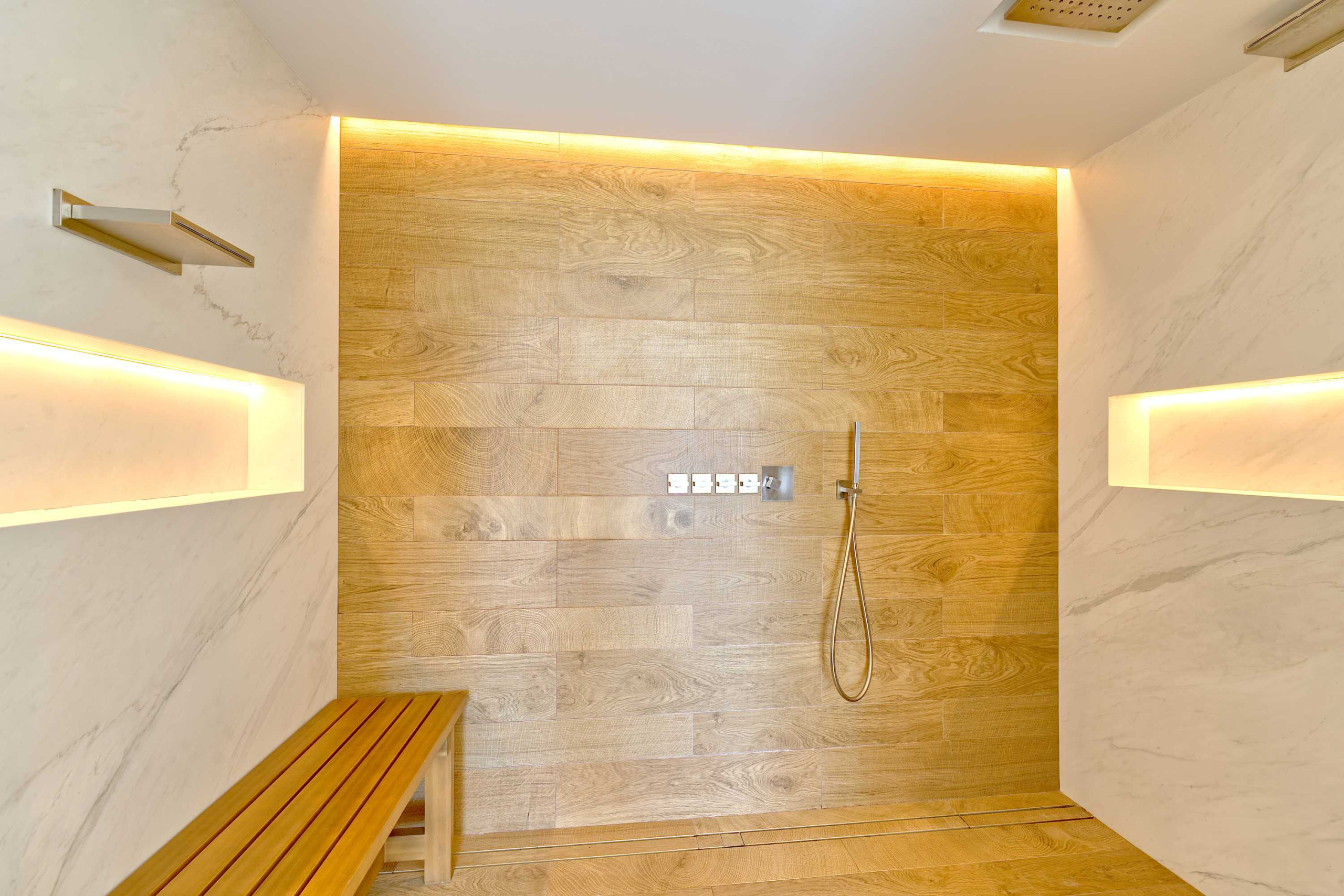 The ground floor features an inviting living space, along with a guest toilet and a large bathroom with a walk-in rain shower. On the first floor, you'll find additional luxurious living spaces with private terraces. The master bedroom is a highlight, featuring an open-plan bathroom with a large indoor Jacuzzi and a private terrace leading to a full Finnish Sauna.