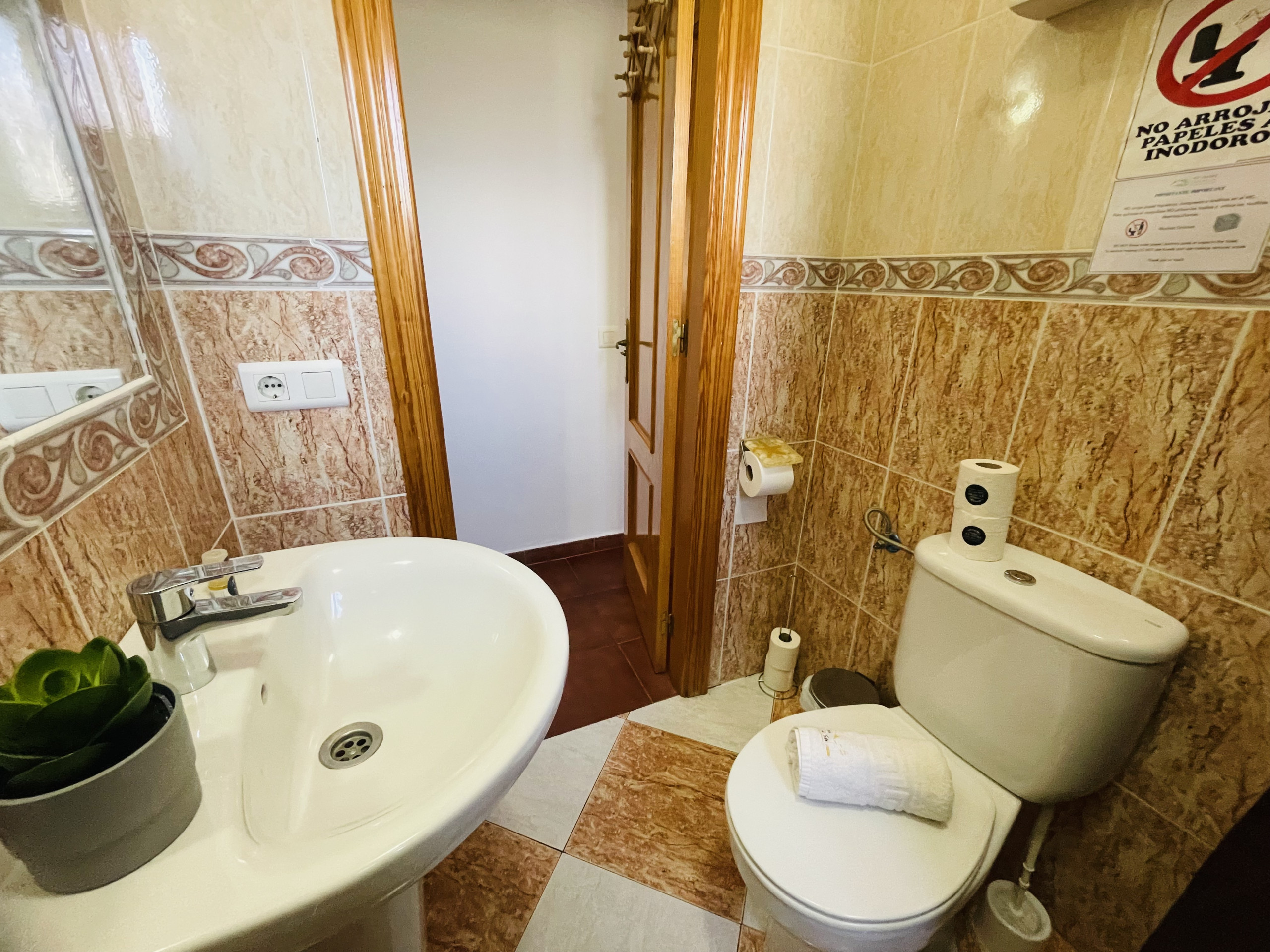 The main floor welcomes you with a spacious and bright open-plan living room, where a wood-burning fireplace invites you to enjoy long, cozy evenings in winter. The fully equipped American-style kitchen blends traditional character with modern functionality. The cortijo also offers TV and WiFi, so you can stay connected while enjoying a relaxing escape.