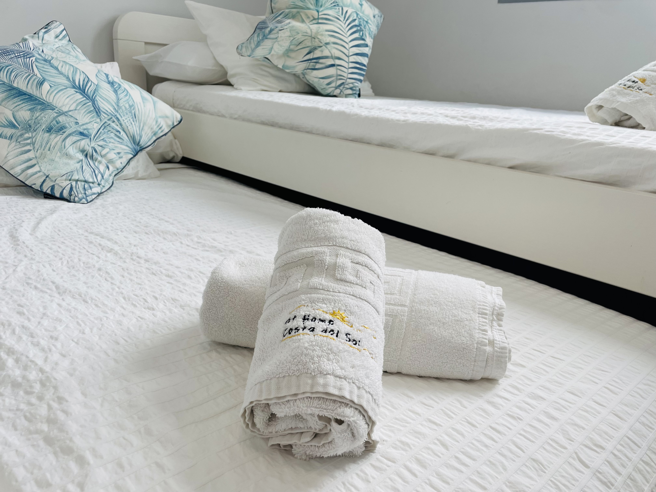 L'appartement dispose de trois chambres, conçues pour répondre à tous vos besoins. La chambre principale offre un lit double, un balcon privé avec vue sur la mer et une luxueuse salle de bains attenante, où vous pourrez vous détendre et vous ressourcer après une journée de plaisir à la plage. Les deux autres chambres sont parfaites pour les familles ou les groupes d'amis, avec un lit superposé dans l'une et un lit gigogne dans l'autre, offrant de l'espace pour tout le monde. De plus, une autre salle de bains avec une cabine de douche est disponible pour plus de commodité.
