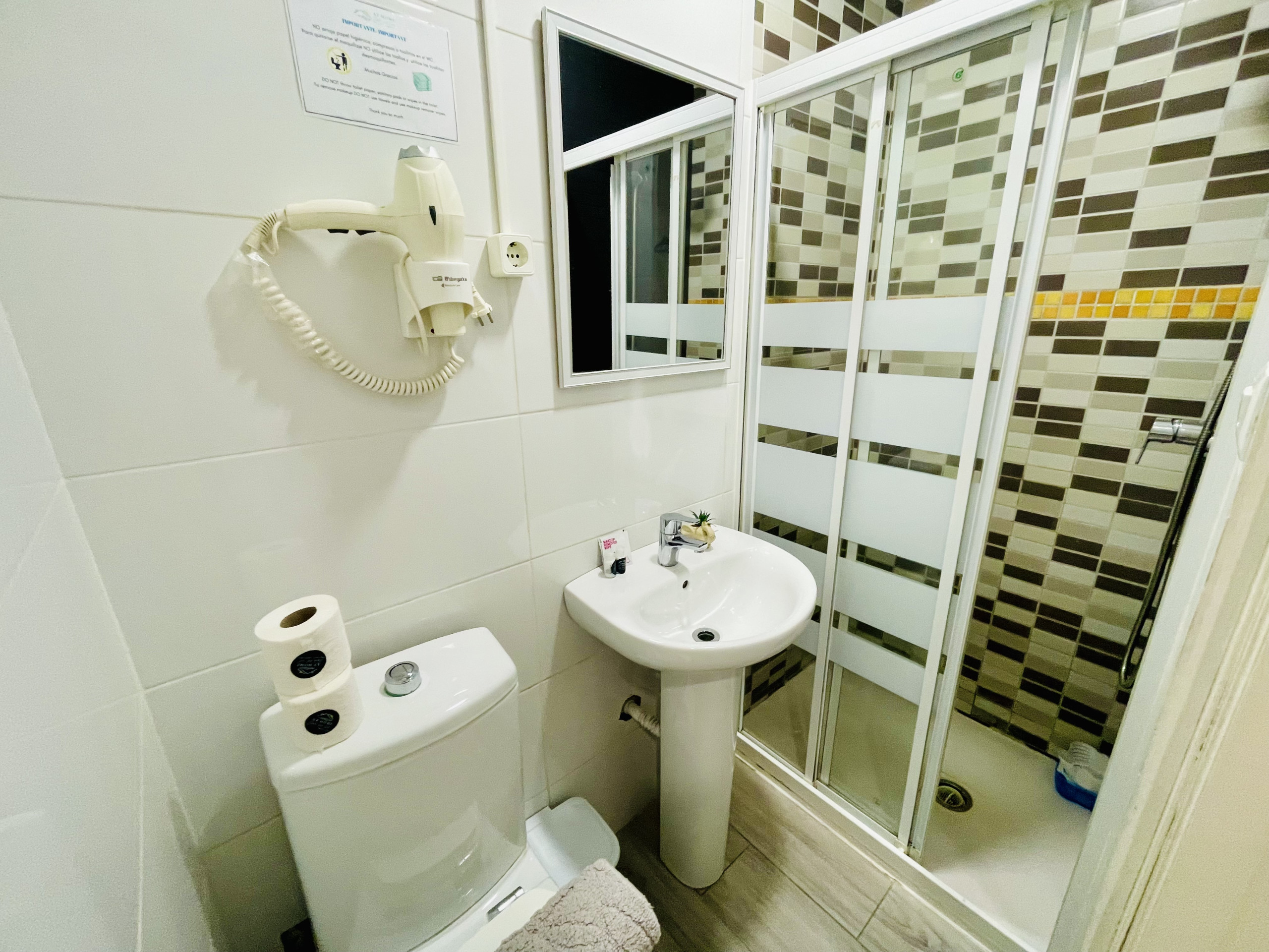 La salle de bains, équipée d'une douche moderne, offre toutes les commodités nécessaires pour commencer la journée en pleine forme. De plus, vous pourrez profiter d'un moment de divertissement avec la télévision, et une machine à laver est à votre disposition pendant votre séjour.