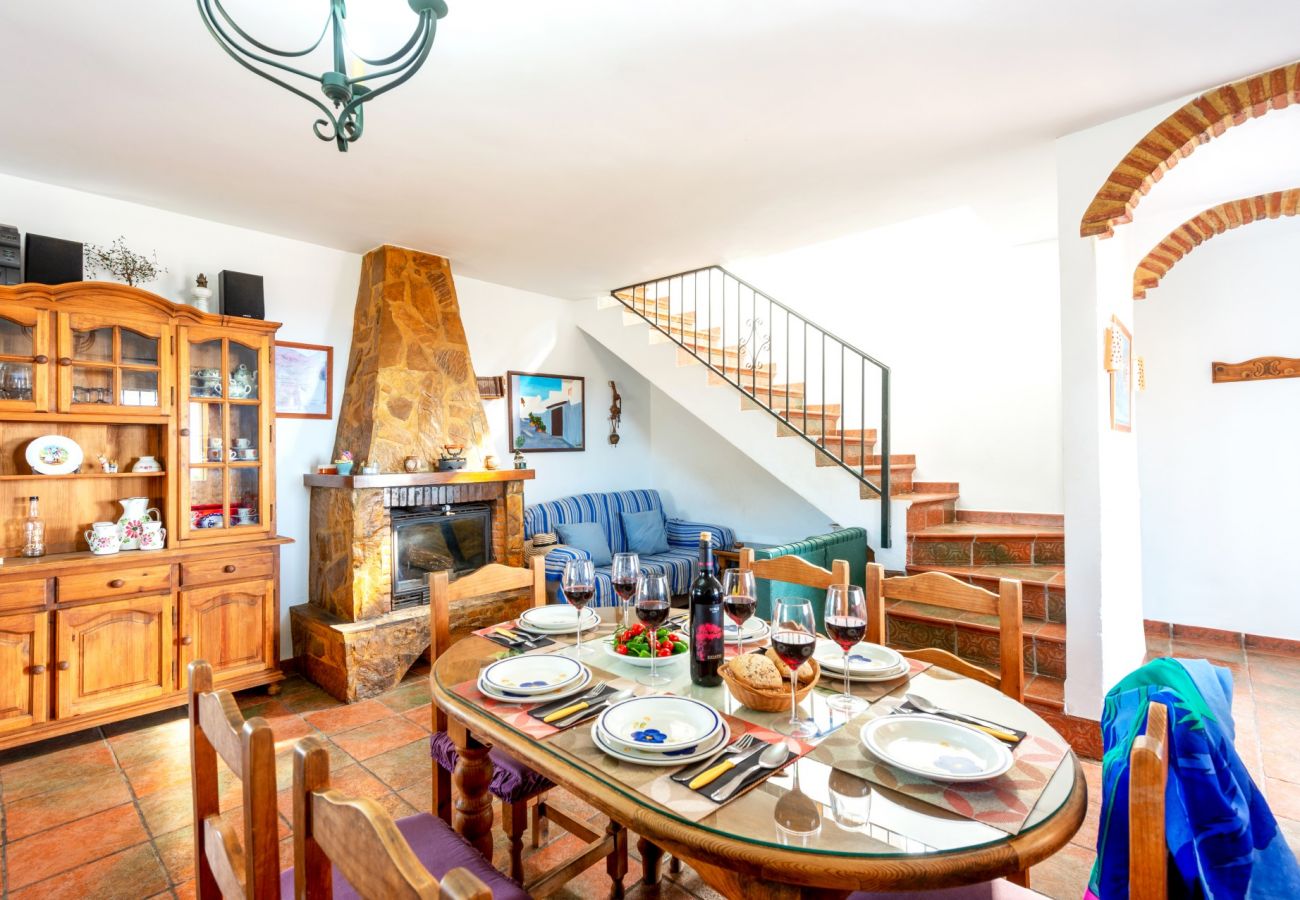 Au rez-de-chaussée, la maison s’ouvre sur un vaste et lumineux salon ouvert, où une cheminée à bois invite à des soirées chaleureuses en hiver. La cuisine américaine, entièrement équipée, allie le charme traditionnel à la modernité. Le cortijo est également doté d’une TV et d’une connexion WiFi, permettant de se détendre tout en restant connecté.