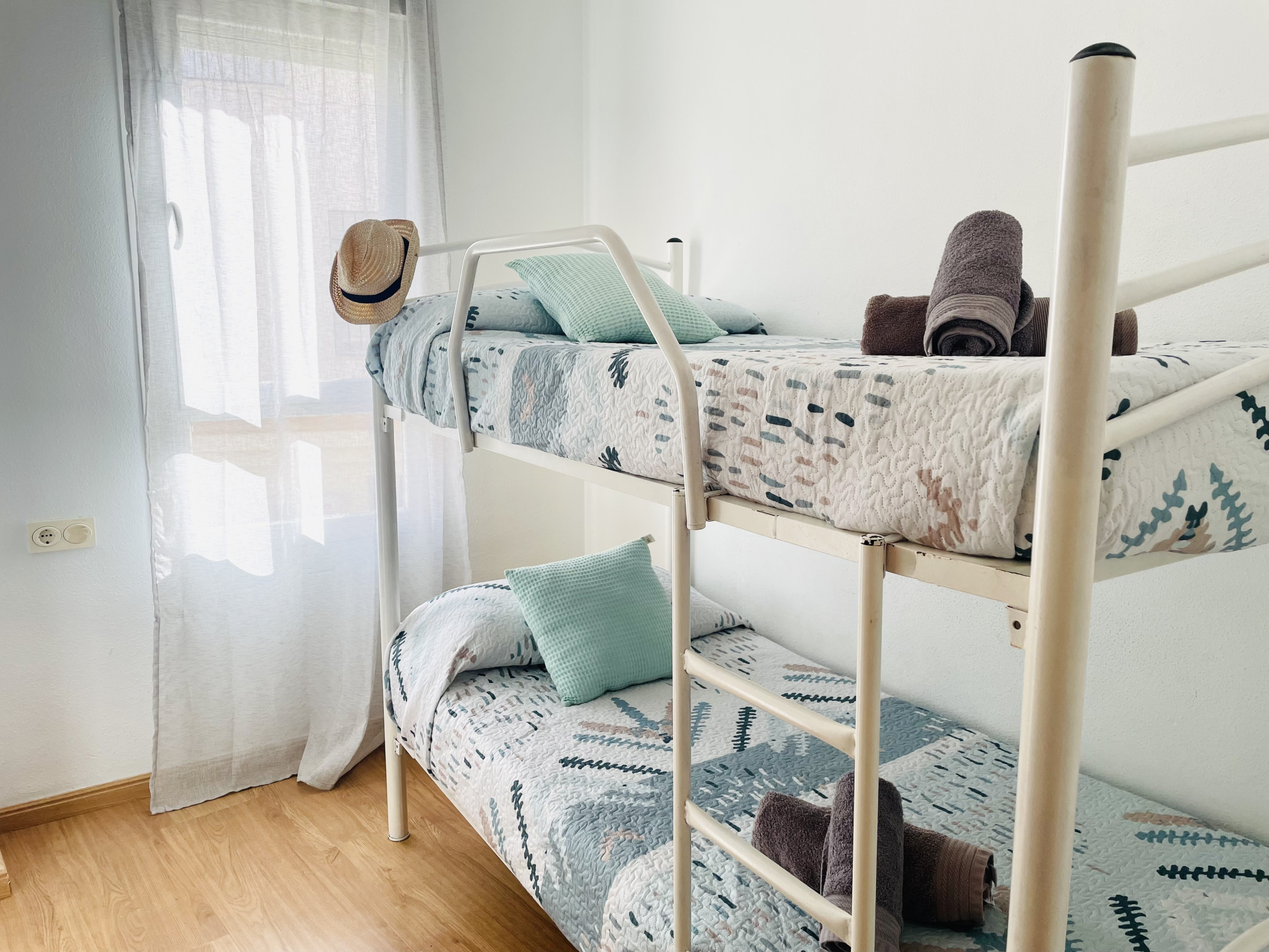 L'appartamento dispone di 2 camere da letto, una con un letto matrimoniale e l'altra con un letto a castello, un bagno completo e un soggiorno con area salotto e TV. La cucina è completamente attrezzata con piano cottura, forno a microonde, frigorifero, lavatrice, macchina per il caffè e bollitore.