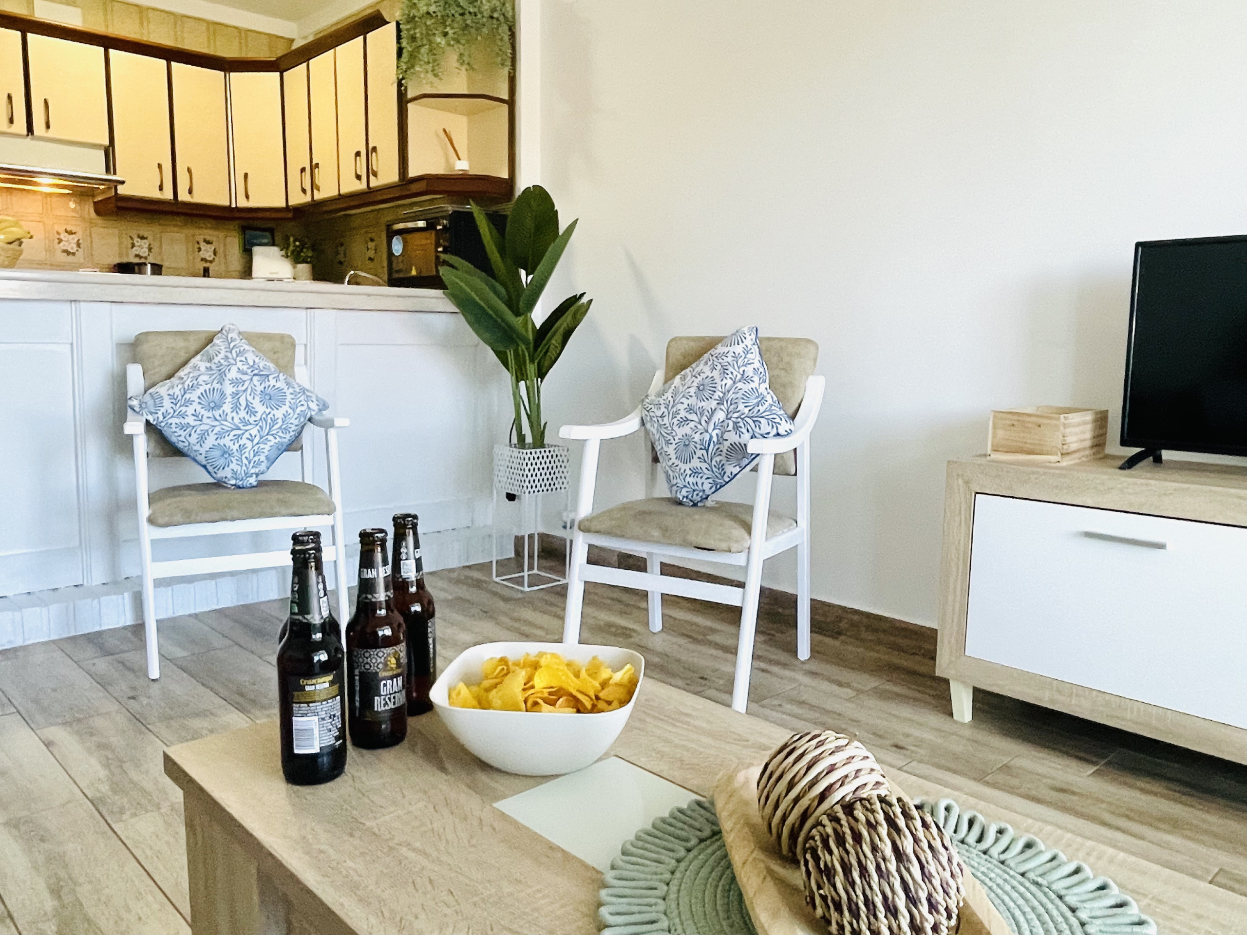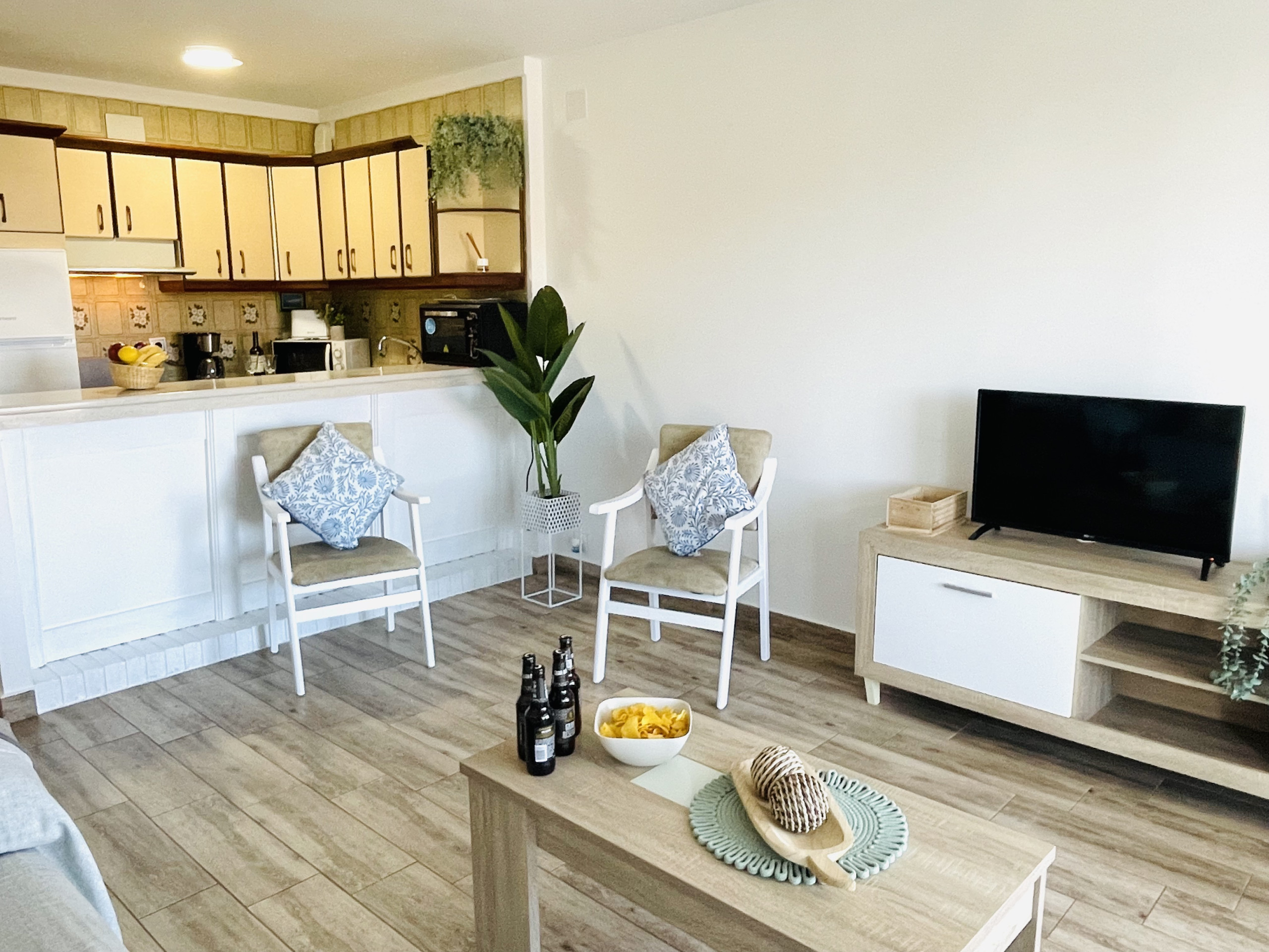 Il soggiorno con cucina americana completamente attrezzata è spazioso e luminoso, dotato di aria condizionata, TV con canali internazionali, perfetto per godersi il soggiorno.