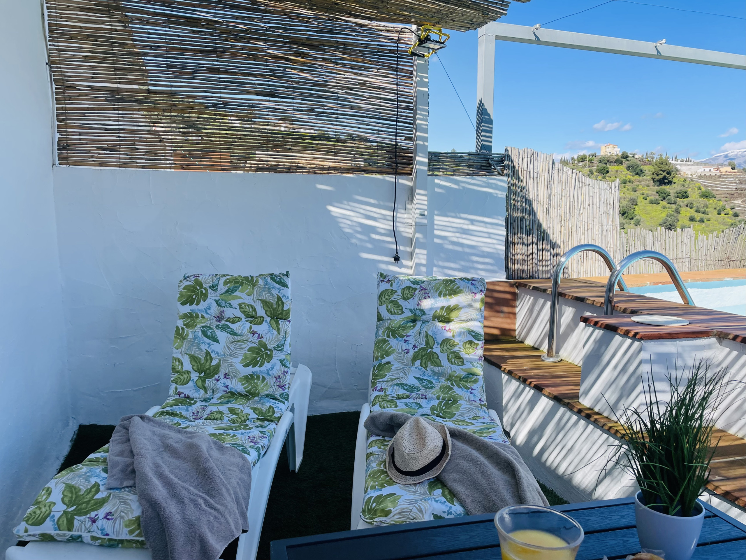 Para momentos de relaxamento, o cortijo conta com uma pequena piscina com vista para as montanhas e um solário privativo no terraço, perfeito para tomar sol e aproveitar o clima mediterrâneo.